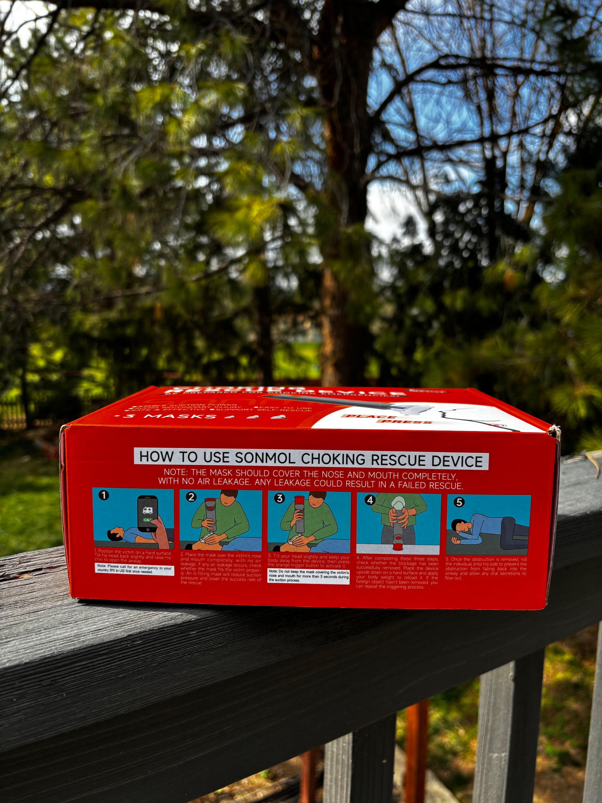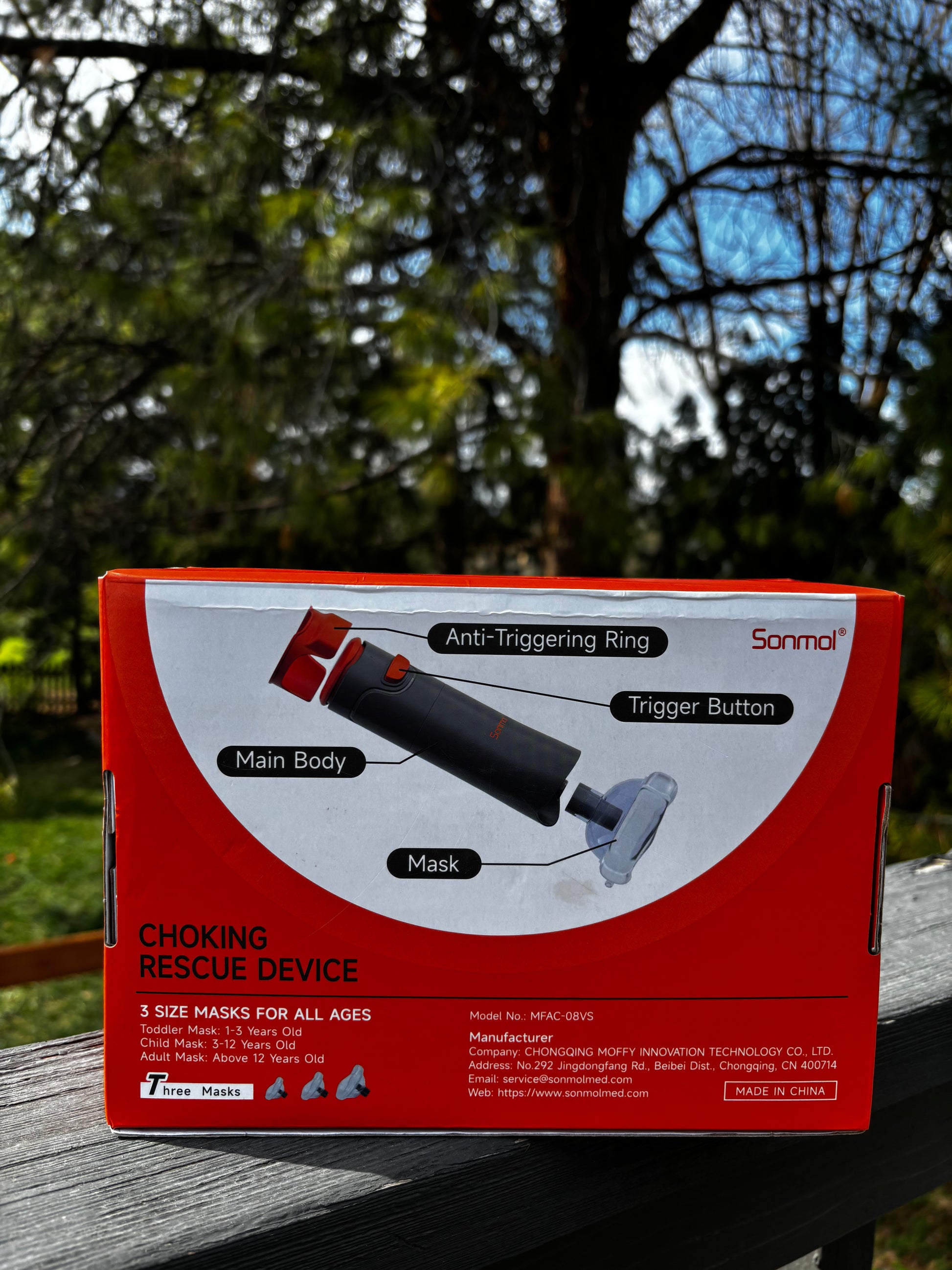Simple operation – press the trigger button to activate the device. Non-invasive device to clear a person's airway when traditional choking first aid fails.